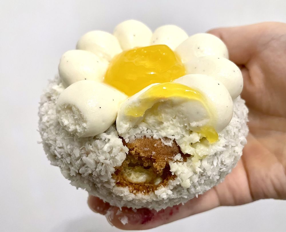 Choux pastry filled with mango cremeux, mango jelly, and topped with mango whipped cream.